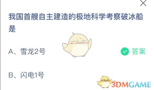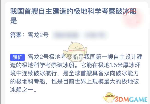 软件提交 专题合集 热门手游我国首艘自主建造的极地科学考察破冰船是?支付宝小鸡课堂开课啦!每天花一分钟答题赚饲料,喂喂小鸡就能贡献爱心啦!轻松又意义十足!2025年10月20日蚂蚁庄园的小鸡课堂题目正确答案是【雪龙2号】,雪龙2号极地考察船是中国首艘自主建造的极地科学考察破冰船,2019年7月交付使用,标志着中国进入“双龙探极”时代。