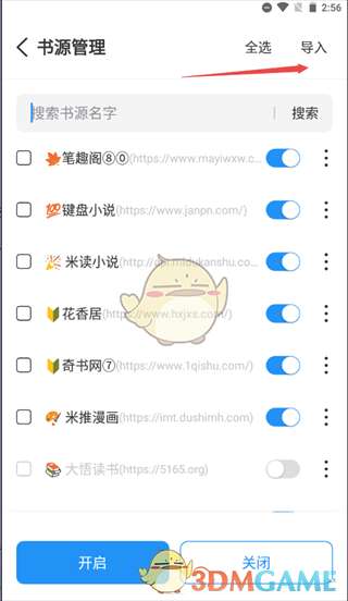 3、跳转到书源管理页面后点击右上方的导入按钮。