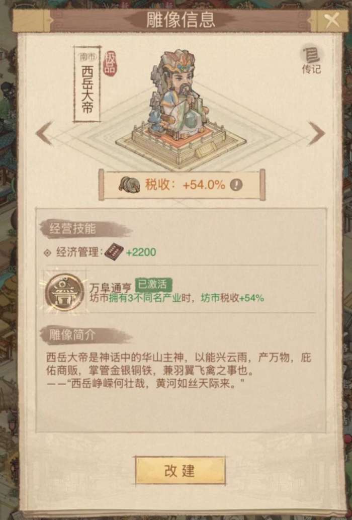 经营技能:坊市拥有农、工、商业时,坊市税收+12%。