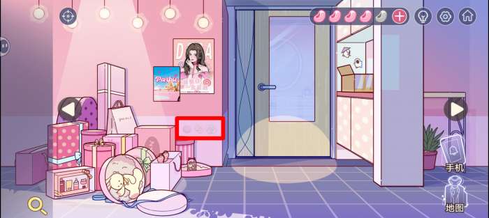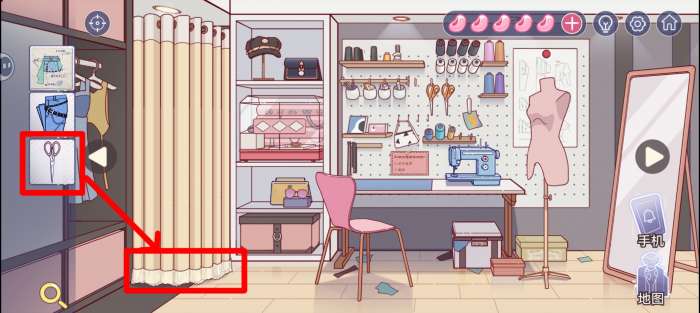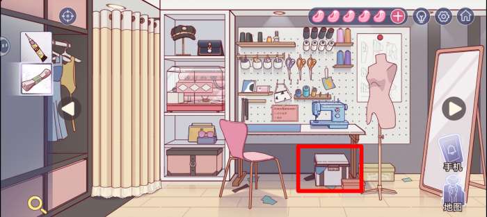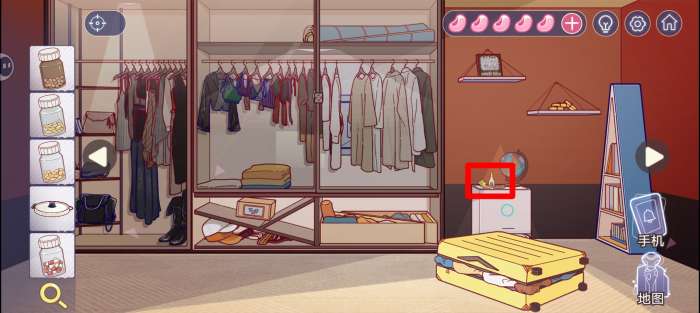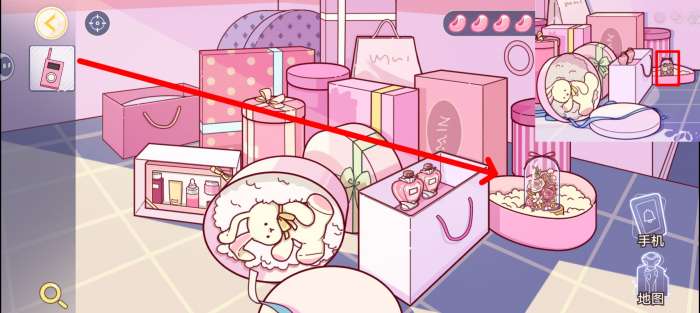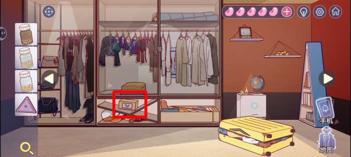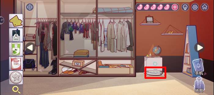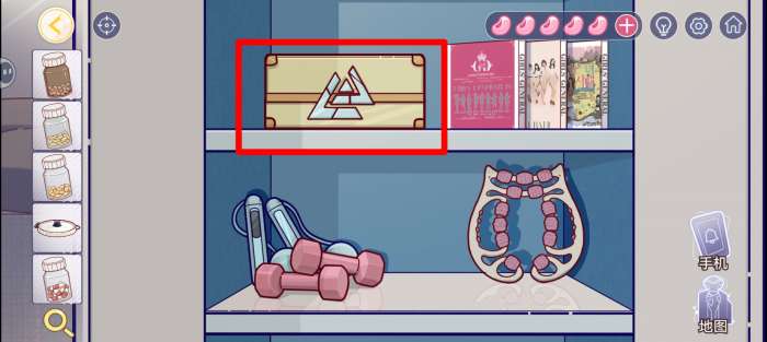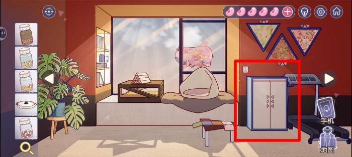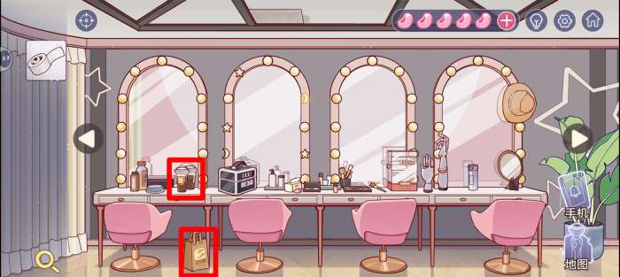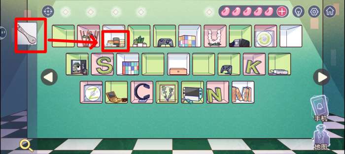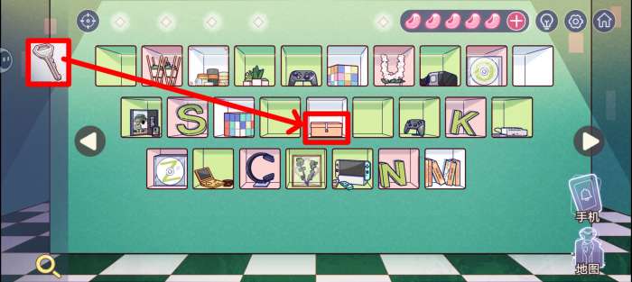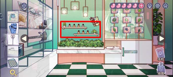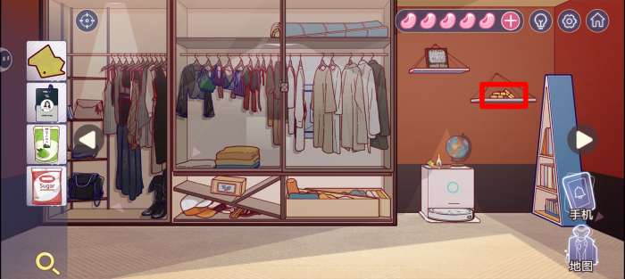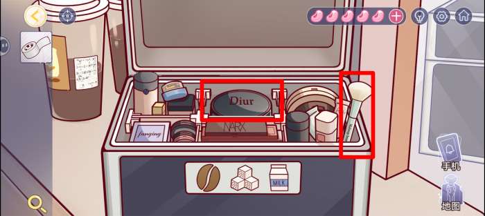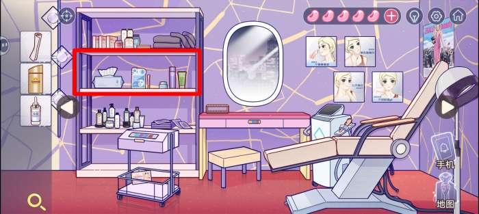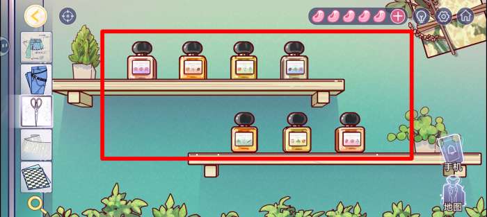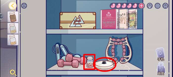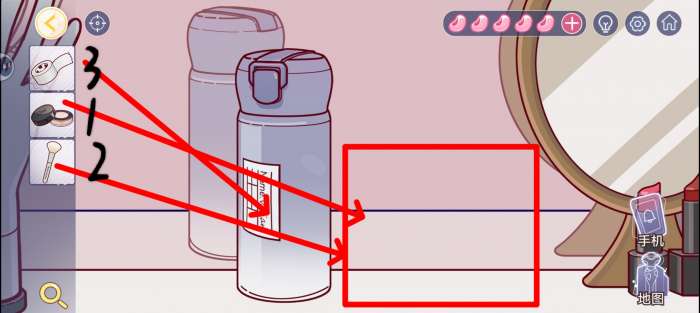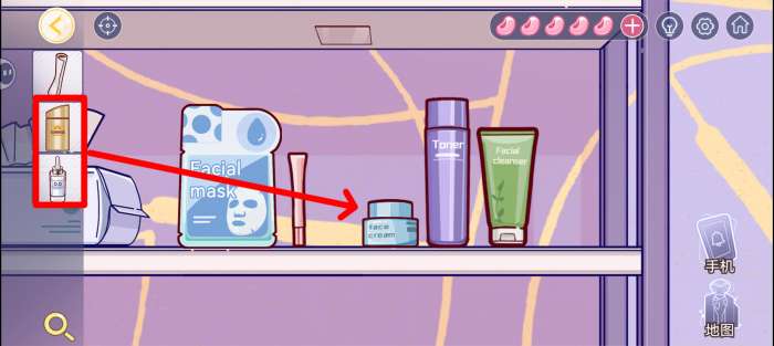 26.点击此位置,把【精华】和【防晒霜】放到柜子上,将顺序调整为图三的顺序,点击获得【钥匙】