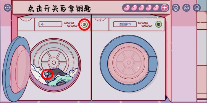 2.点击【脏衣服】和【洗衣液】后点击洗衣机,将【脏衣服】放入洗衣机中,【洗衣液】倒入洗衣机槽中,拉下熨板把熨斗放上去