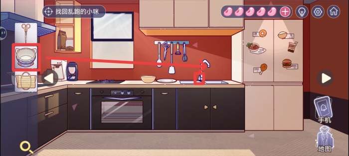 59.把【猫碗】【剪刀】【菜篮子】按图二放到灶台上,获得【小咪】