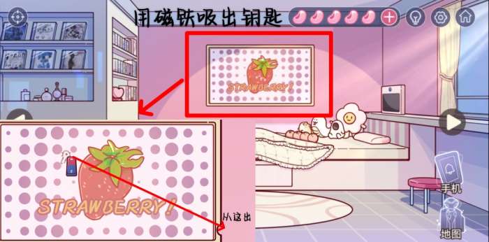 7.点击挂画,用【磁铁】吸住【钥匙】后,拖到下方缺口处移出来