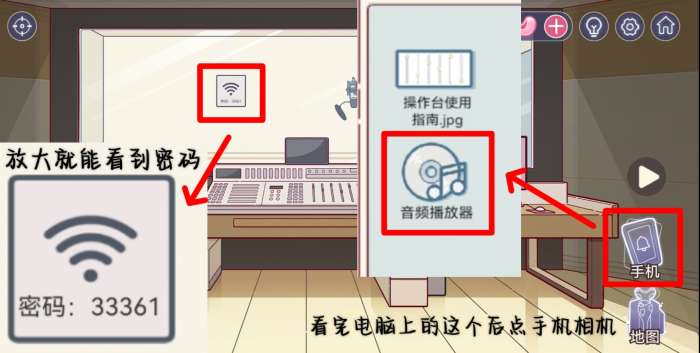 3.点击电脑里的音频播放器,将视频看完后点击手机,使用相机并放大,可以看到WiFi密码是:33361