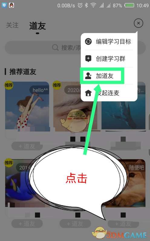 5、在打开的选项菜单中,有个添加道友选项,点击加道友。如图所示