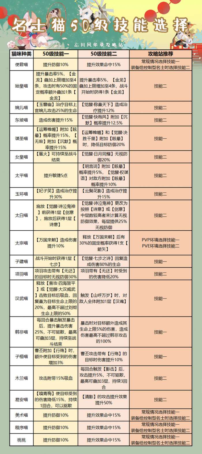 给大家做了一个关于名士猫50级技能的选择,大多数以通用性强作为出发点选择的。