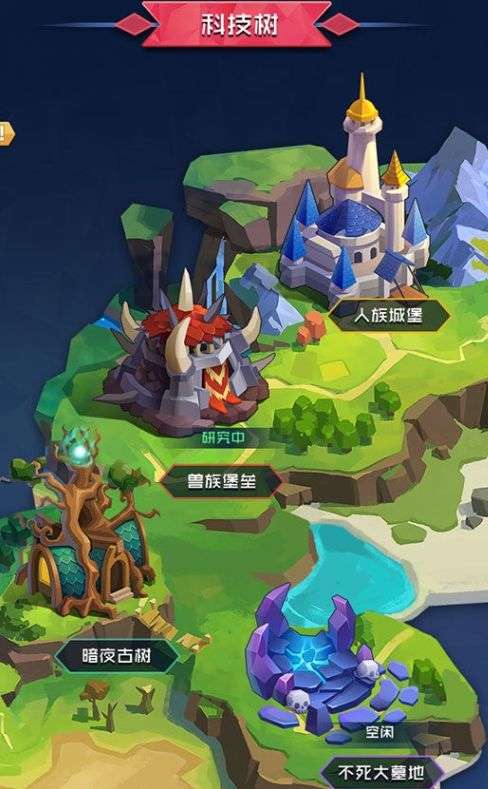 科技树是强化各阵营角色能力的地方,同时科技树需要花费一定资源与时间才能完成研究。科技树设置了四大阵营,分别对应我们的人族、兽族、暗夜与不死族。