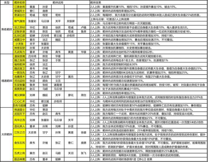 神将、名将、良将拥有3个羁绊,勇将仅有2个羁绊。根据羁绊品质、加成,羁绊分为熟练羁绊、精通羁绊、大师羁绊,品质越高的羁绊加成效果越大。