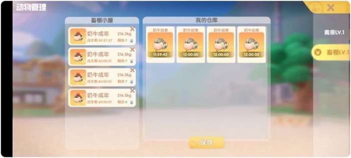 动物仓库:这个是管理你购买的小动物的,每个小屋目前只能养四只小动物,所以要合理规划一下自己的养殖;