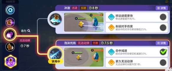 可达鸭喷射泡泡对前方对方宝可梦造成特攻伤害。对方宝可梦会被多个泡泡附着一定时间。每次被我方宝可梦攻击时泡泡会进裂并对当前目标造成额外特攻伤害,泡泡全部进裂时,目标会在一定时间内无法动弹。