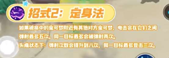 如果被命中的宝可梦附近有其他对方宝可梦,电击会在它们之间弹射最多五次。同一目标最多会被弹射两次。