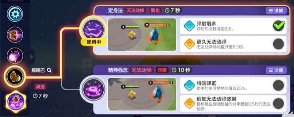 可达鸭向指定目标放出会限制招式的念力攻击,造成特攻伤害和一定时间的无法动弹并使其上次进入等待时间的招式延长,如果目标没有处于等待时间中的招式,则会延长下次所使用招式的等待时间。此效果触发时,目标会被百分比减速持续一定时间。