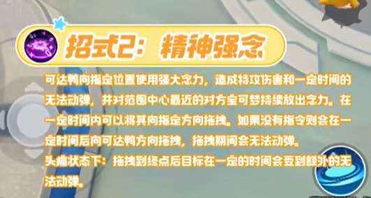 可达鸭向指定位置使用强大念力,造成特攻伤害和一定时间的无法动弹,并对范围中心最近的对方宝可梦持续放出念力。在一定时间内可以将其向指定方向拖拽。如果没有指令则会在一定时间后向可达鸭方向拖拽,拖拽期间会无法动弹。