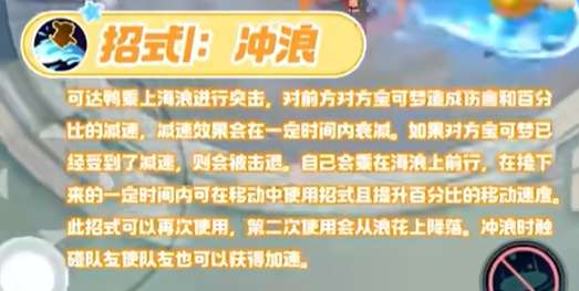 自己会乘在海浪上前行,在接下来的一定时间内可在移动中使用招式且提升百分比的移动速度。
