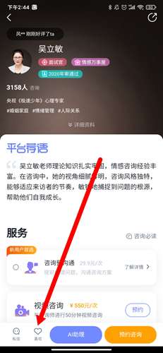 1、首先打开软件,在咨询界面找到我们想要关注的那个老师,点击ta的头像来到其个人界面。