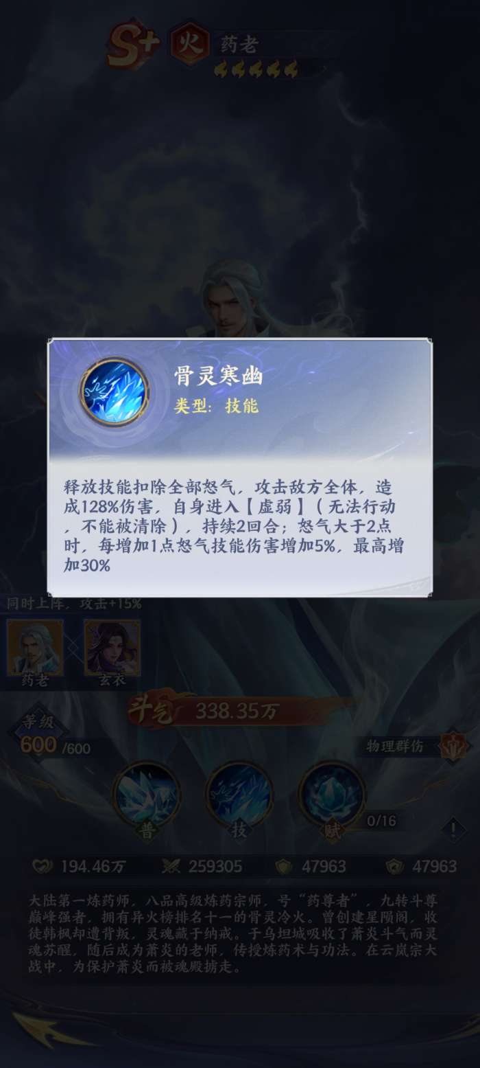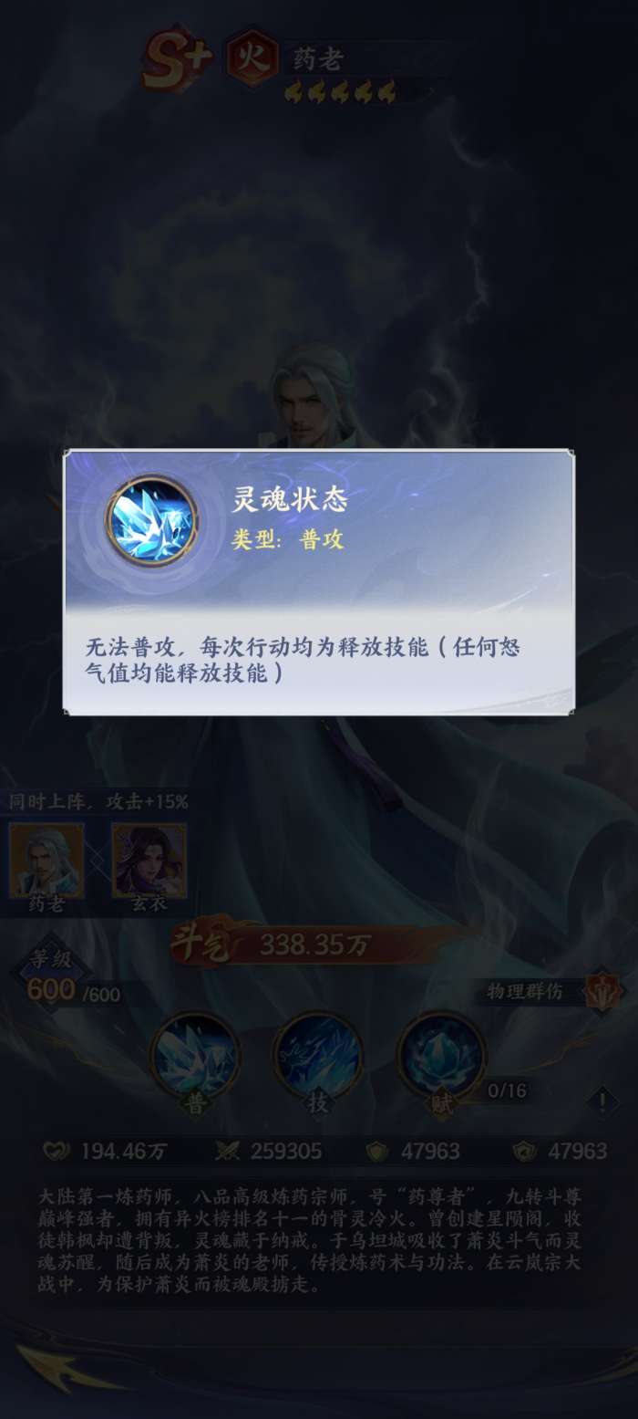 药老其实是萧炎的老师,在整个游戏当中,实力是比较强的,它属于火属性的S+级别的角色。目前玩家在体验该游戏的时候,如果在游戏初期的时候已经获得药老,那么就直接利用它来开荒,因为他能够在游戏初期推图,有他加入之后,效率将会更高,毕竟它已经抛弃了普通攻击,简单来说就是在战斗的时候,他能够直接释放技能,并且在开局的时候就直接将输出拉满,这其实是他开荒的关键。