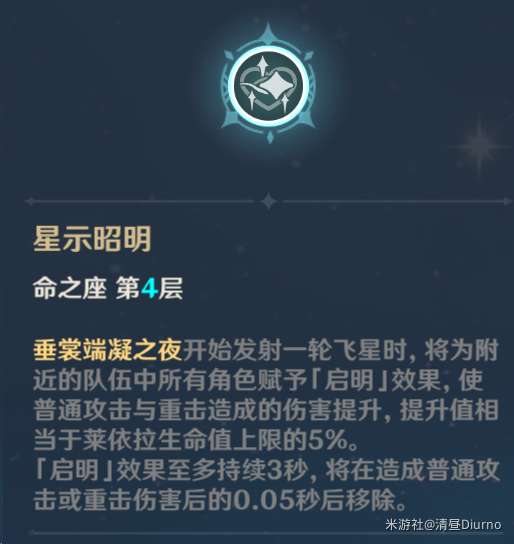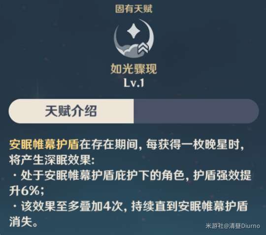 莱依拉展开护盾,进入梦乡,并缓慢生成晚星。在护盾庇护下的角色释放元素战技也会获得晚星,晚星达到四枚将会飞出并攻击敌人,造成冰元素伤害。