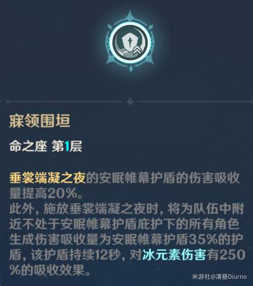 一命,盾辅关键命座,同时提供吸收伤害提升和联机盾,可以在联机中快乐睡觉啦!
