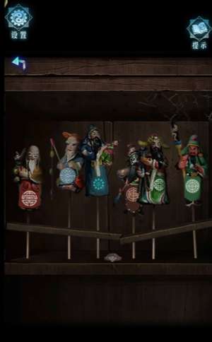 5、亥三刻时间调整后,天井池子石墩下方出现荧光图案,观察图案从左到右的顺序,根据荧光图案顺序,调整堂屋架子上的面人顺序为如图所示.