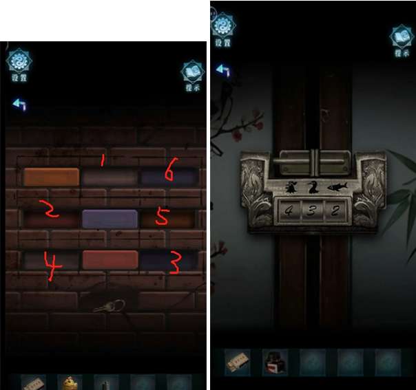7、看堂屋架子上的册子最后一页,可得“数字为需要点击的矩行的顺序,数字的颜色为需要点击的矩形的颜色”的线索;即:第一格里面黄色的1需要点击第一排里黏黄色的矩形,以此类推,根据厨房窗户上的数字及颜色,按如图所示顺序进行墙砖点击.