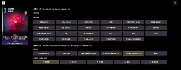 第二张卡牌”神圣一击“,在启动”消灭“状态后,此卡牌的伤害可以达到200%,达成的流血量十分可观,建议使用的神词条包括”卡牌的韧性增加100%“、”此卡费用减少1“、”赋予目标痛苦4“,这四个词条可以减少相关费用,而且在流血量上也起到了较强的辅助作用。