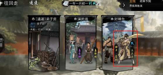 3、睡醒后继续找蒋胜英对话,选择自己想要学的武学,选完去内院依次找夏胜元、穆少秋、全胜芳对话,对话后去通道找贾明对话。