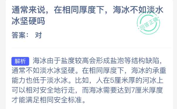 以上就是通常来说,在相同厚度下,海冰不如淡水冰坚硬吗?神奇海洋今天答案最新2026年1月19日分享,更多相关攻略内容,请点击关注pk游戏网更新!
