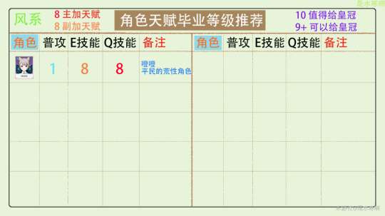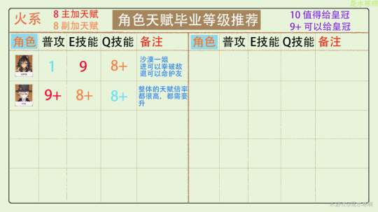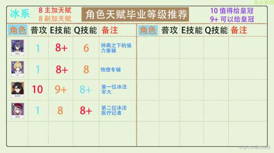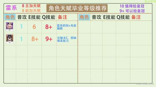 9+角色的天赋可能会给自身或团队成员带来较大的提升,因此可以考虑给予皇冠评价。有些天赋虽然会对角色提升很大,但因为角色本身的实力或在未来的泛用性上表现不够出色,所以可以根据自己的情况选择是否给予皇冠。对于资源充裕的玩家来说,完全可以考虑给予皇冠评价。