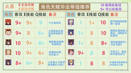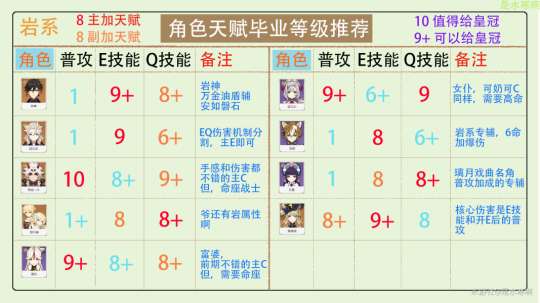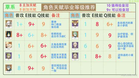 补充:图表中所有的天赋推荐等级,均未包括命座带来的等级加成。