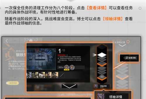 保全任务分为8个阶段,右侧有查看详情的选项。随着任务的进行,难度会逐渐增加。我们可以点击领袖详情来查看作战领袖的详细信息,方便我们调整选择英雄。