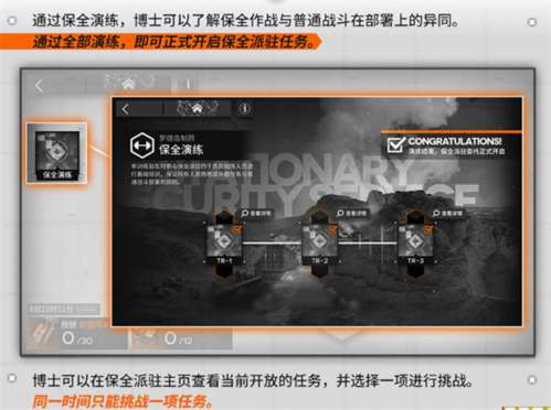 第一个训练项目是保全演练,其目的是为了对参与外勤任务的干员和指挥人员进行基础培训,确保所有人都了解外勤任务和普通战斗之间的不同之处。