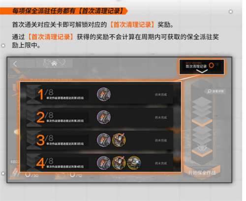 每个保全任务都有一个首次清理记录,这意味着当您首次通关对应关卡时,就可以解锁对应的首次清理记录奖励。通过完成这个任务,您将获得奖励,且这些奖励不会计算在周期性奖励上限之内。