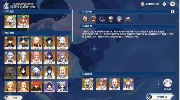 攻略:系统给出的buff能够造成范围水伤,范围回复生命值,提升精通,因此首先考虑妮绽放队伍