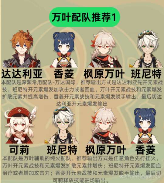 ⑤配队方面,万叶在配队方面有着极为广泛的选择,可以进入绝大部分水、火、冰、雷元素输出配队。但是,受其天赋限制,对于岩队、风队、物理队、草队的增伤效果并不显著。万叶可以和传统的神鹤万心、万达国际、雷九万班等配队组合,也可以进入像万芙闲班这样的新版本配队。