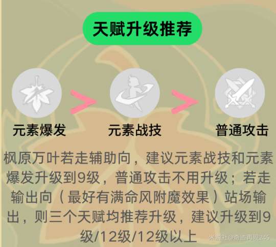③天赋方面,万叶的伤害输出主要依靠其固有天赋二,通过触发元素反应来获得对应元素的伤害提升效果。建议适当升级元素战技和元素爆发的倍率以增加输出能力。如若追求纯输出,建议解锁六命,获取风附魔,并提升普攻、重击以及下落攻击的伤害加成,同时提升天赋等级以增强输出能力。