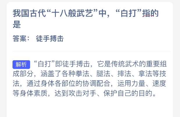以上就是我国古代“十八般武艺”中,“白打”指的是?支付宝蚂蚁新村最新答案2025年12月10日,更多精彩内容,请点击关注pk游戏网更新!