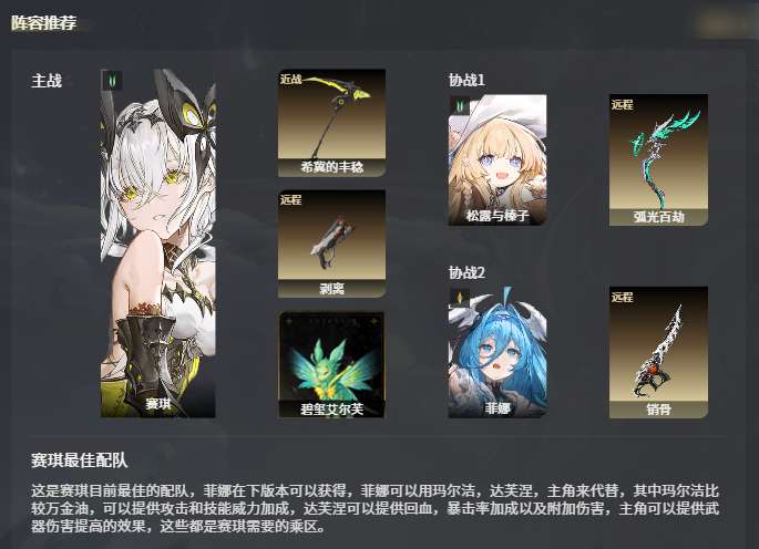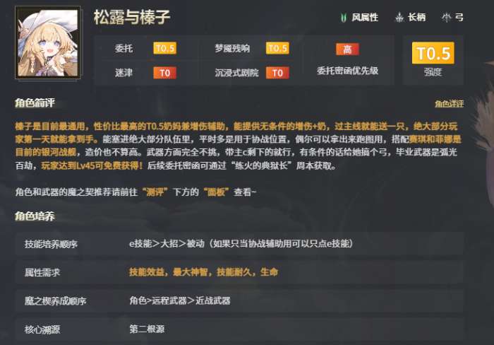 榛子是目前最通用,性价比最高的T0.5奶妈兼增伤辅助,能提供无条件的增伤+奶,过主线就能送一只,绝大部分玩家第一天就能拿到手。能塞进绝大部分队伍里,平时多是用于协战位置,偶尔可以拿出来跑图用,搭配赛琪和菲娜是目前的银河战舰,造价也不算高。武器方面完全不挑,带主c剩下的就行,有条件的话给她搞个弓,毕业武器是弧光百劫,玩家达到Lv45可免费获得!后续委托密函可通过“练火的典狱长”周本获取。