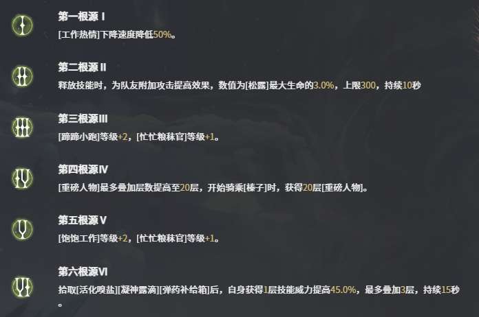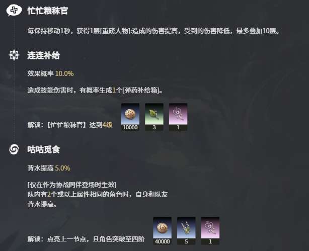 饱饱够给你做技能在骑乘小猪时能额外获得100点工作热情,提升移动速度并对沿途敌人造成伤害。忙忙粮秣官技能每次释放后都能获得重磅人物效果,最多叠加10层,可以降低受到的伤害并提高输出能力。
