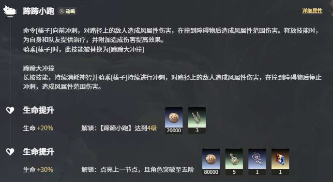蹄蹄小跑是松露的核心技能之一。发动时可以让小猪向前冲刺,对路径上的敌人造成风属性伤害。同时还能为自身及附近队友提供治疗效果和伤害加成。在骑乘状态下,这个技能会得到强化,长按技能键可以持续消耗神智来维持效果。
