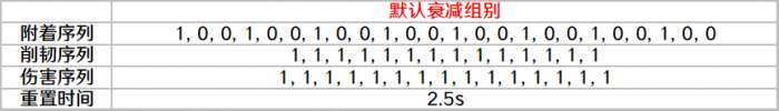 ◆衰减组别:附着冷却的实现效果,由附着、削韧、伤害三个序列和重置时间组成,也称为计时器,,其中伤害序列被我称为伤害递减序列。