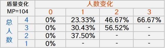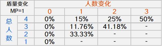 设敌方的MP为1,那么在同一区域聚集n人时,每变化1个人,盾量就会相比于原来减少15%/25%/50%(n=4) ,11.76%/41.18%(n=3) ,33.33%(n=2):