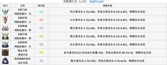 充能则是类似于逆向盾的另一种盾的类型,外观表现为与怒气值相似的圆形充能条,但有充能条的不一定是充能盾,充能与逆向最大的区别是其盾量不会和元素发生反应,且通吃所有元素,再结合盾的性质,属于充能的有如下几个: