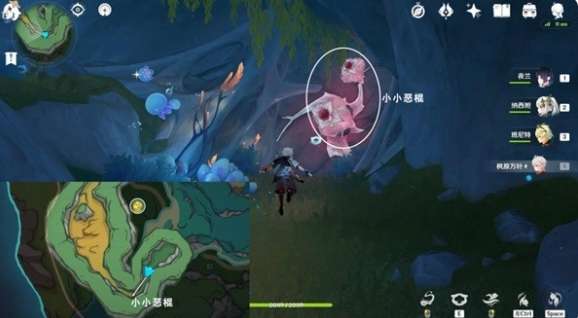 1、往地图的西南方向游,使用战技,投掷帽子炸弹于小小恶棍位置并引爆,开启通道。