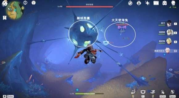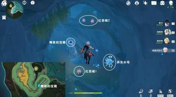 1、往地图的西南方向游,获得异色水母能力,使用战技,投掷帽子炸弹于红恶棍2位置。
