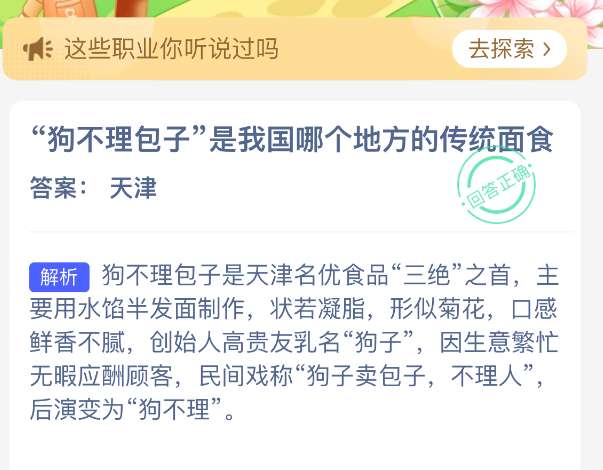 3、答案解析:狗不理包子是天津名优食品“三绝”之首,主要用水馅半发面制作,状若凝脂,形似菊花,口感鲜香不腻,创始人高贵友乳名“狗子”,因生意繁忙无暇应酬顾客,民间戏称“狗子卖包子,不理人”后演变为“狗不理”。