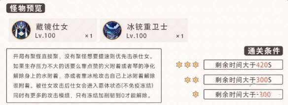 仕女每15秒会释放水光环,CD翻倍,则血量极厚,如果练度不够想要提速只能优先击杀她。如果输出不够还优先考虑击杀冰枪基本与满星无缘,当然击杀冰枪生存压力最少,但也慢慢等CD转好磨死仕女。