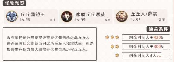 经典的小怪层,如果没有聚怪角色则需要多熟悉站位聚怪,上半间练度低的话生存压力会比较大,同时记得上半间绝对不能纯带冰系输出,下半间不要带纯雷队伍(有场地石)