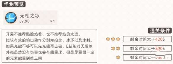 无相冰的难度不大,血量和伤害都比较一般,但是大部分有效输出时间相当少,因此对于输出不够的小伙伴来说需要了解好它的招式,保证将它快速打入锁血阶段,当然带火系正常练度都会比较轻松。