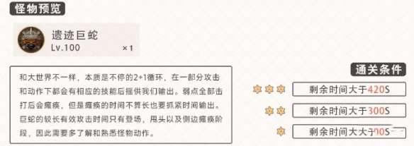 对于练度较低的旅行者来说这方面可能需要多凹,因为蛇的动作是没有百分百保证的说法的,同时可能因为没有及时攻击机器人的弱点导致它们释放各种AOE而暴毙,因此只能多打几次。