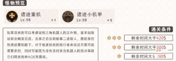 开局三个机器人也是站一排,AOE强力的角色或者纯单体正常攻击遗迹侦察者顺带击杀其他机兵即可。
